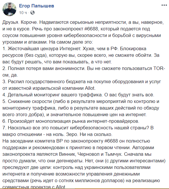 А также отметил, что под соусом повышения уровня кибербезопасности и борьбой с вирусными угрозами и атаками в Украине может наступить жесточайшая цензура в интернете, хуже, чем в России. Она будет сопровождаться потерей анонимности, детальным мониторингом трафика украинских пользователей, монополизацией рынка интернет-провайдеров.