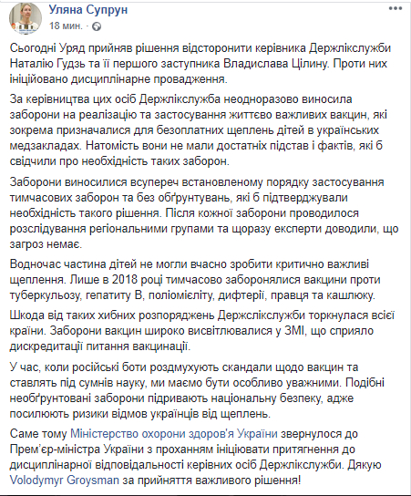 "Под руководством этих лиц Гослекслужба неоднократно выносила запреты на реализацию и применение жизненно важных вакцин, которые в том числе, предназначались для бесплатных прививок детей в украинских медучреждениях. Они не имели достаточных оснований и фактов, которые бы свидетельствовали о необходимости таких запретов", - отметила Супрун.