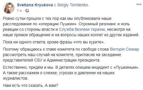 "Ровно сутки прошли с тех пор как мы опубликовали наше расследование по "операции Пушкин". Огромный резонанс и ноль реакции со стороны власти и Служба безпеки України (СБУ - Прим.Ред.), несмотря на наше прямое обращение и на вопросы наших коллег из других изданий.