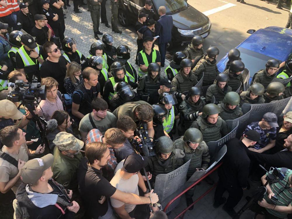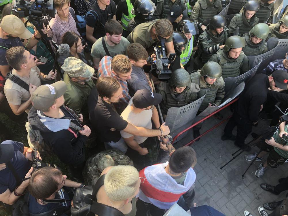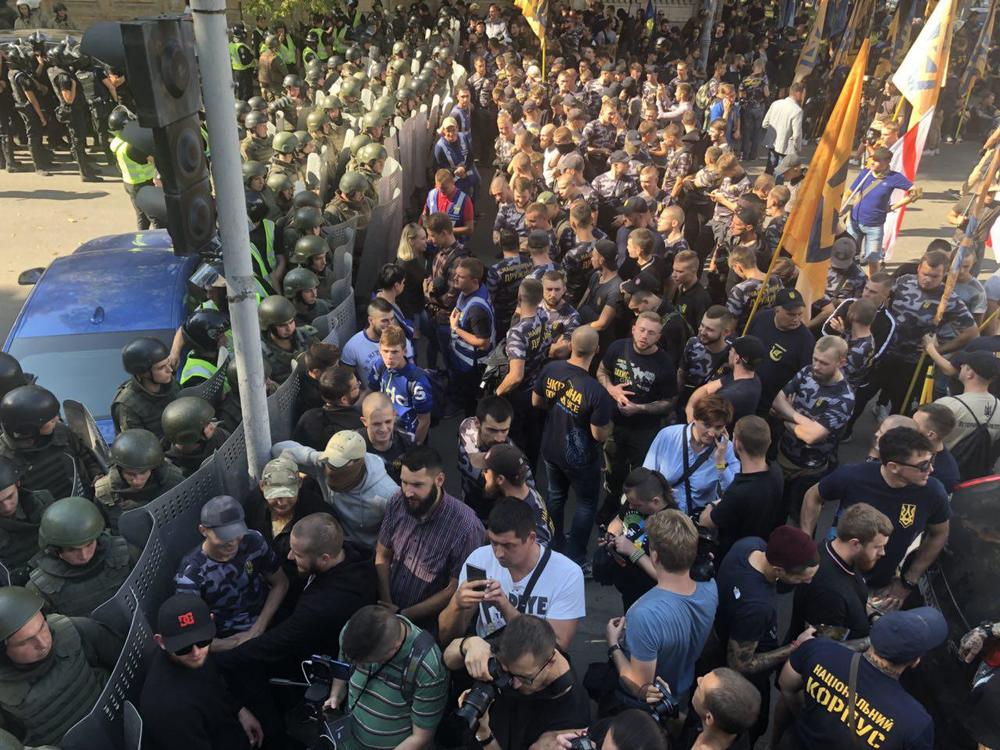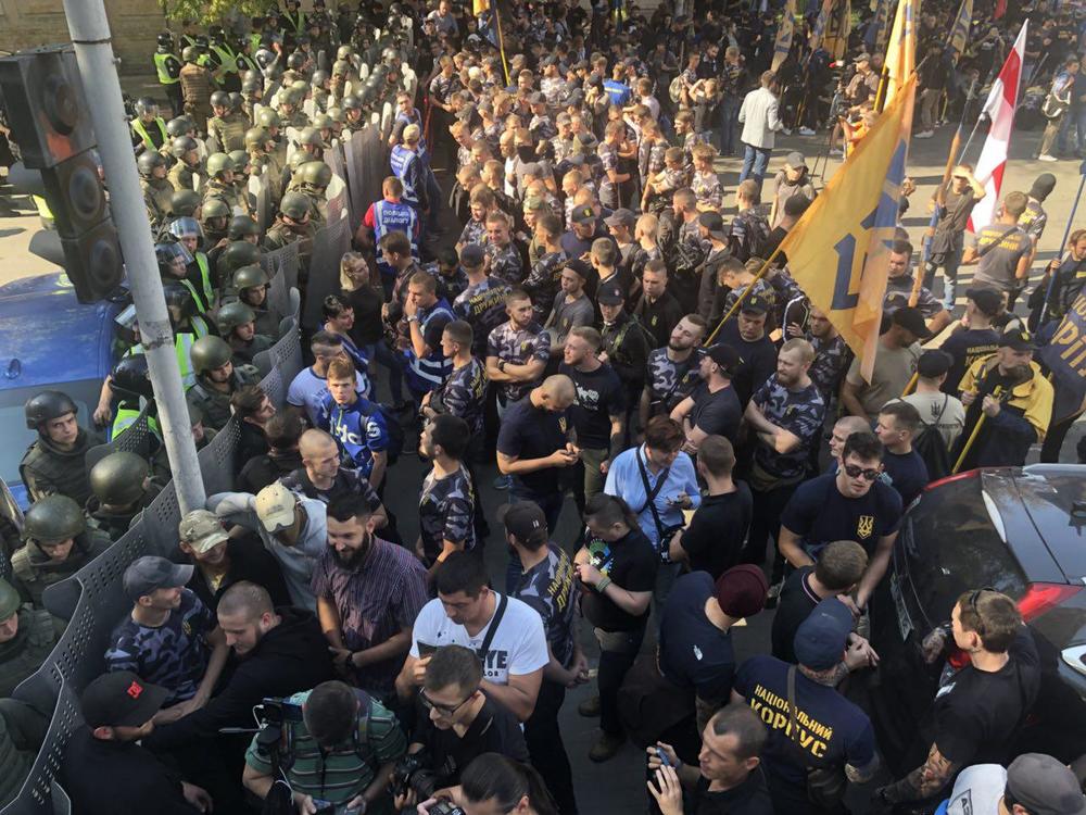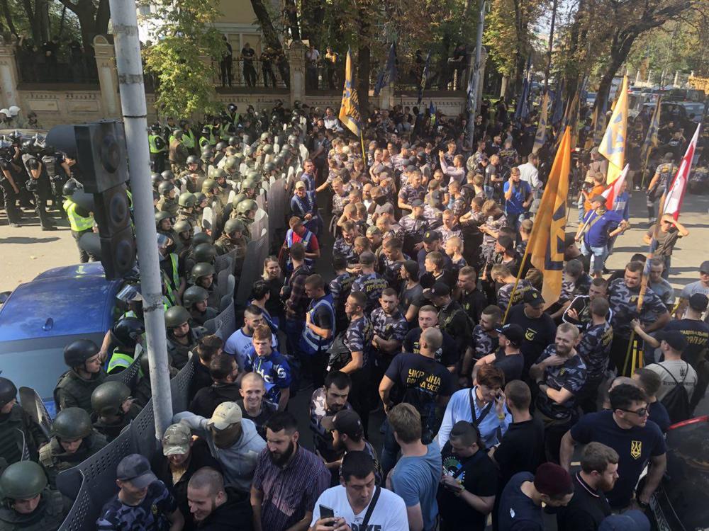 Возле здания АП события начали разворачиваться в 13:30. Среди участников акции - представители "Национальных дружин" и "Национального корпуса" с флагами партии и в футболках организации. На место стянули силовиков, которые перекрыли подход к Администрации Президента и перекрыли Банковую улицу.