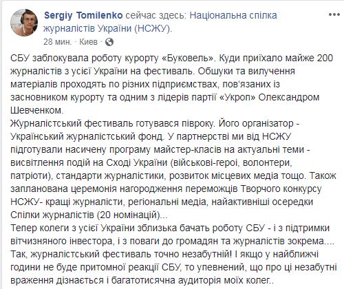 "СБУ заблокировала работу курорта "Буковель". Куда приехало почти 200 журналистов со всей Украины на фестиваль. Обыски и изъятия материалов проходят на разных предприятиях, связанных с основателем курорта и одним из лидеров партии "Укроп" Александром Шевченко", - пишет Томиленко.