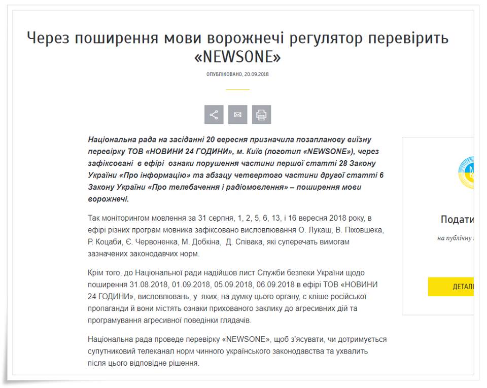 20 сентября Национальный совет Украины по вопросам телевидения и радиовещания назначил внеплановую выездную проверку телеканала NewsOne, объясняя это зафиксированными в эфире признаками нарушения части первой статьи 28 Закона Украины "Об информации" и абзаца четвертого части второй статьи 6 Закона Украины "О телевидении и радиовещании" - распространение языка вражды. Об этом сообщается на сайте Нацсовета.