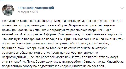 "Не имею ни малейшего желания комментировать ситуацию, но обязан пояснить, почему не смогу принять участия в выборах. Вчера ночью при возвращении домой из России, на Успенском погранпункте российские пограничники в незатейливой, но корректной форме объяснили мне, что они меня не выпустят, и что мне нужно возвращаться назад в РФ. Причины названы не были, но они и так понятны. К исполнителям вопросов и претензий не имею, к заказчикам, в принципе, тоже", - написал он.