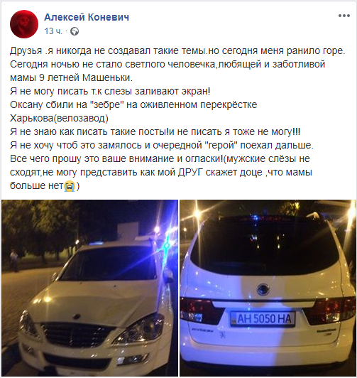 Полиция устанавливает детали ДТП. Между тем, как сообщает знакомый погибшей, харьковчанин Алексей Коневич, у женщины осталась 9-летняя дочь Маша. Также он пишет о необходимости предать огласке произошедшее, чтобы водитель не смог уйти от ответственности.