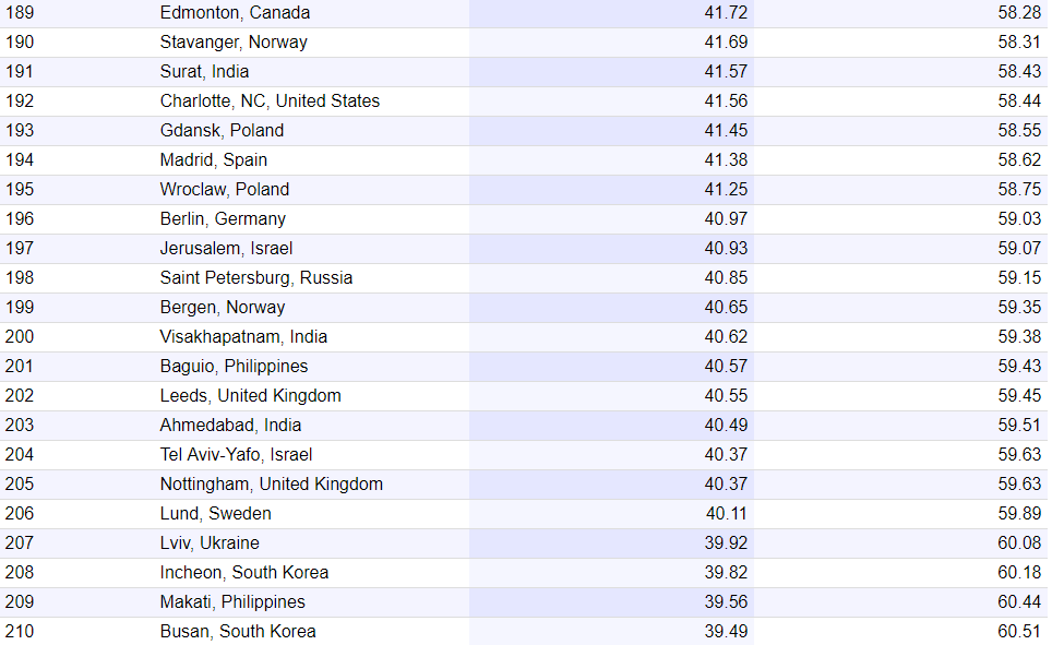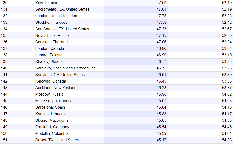 В списке из 327 городов Киев занимает 130 место с индексом 47,9 (индекс безопасности 52,1), Харьков находится на 139 месте с индексом 46,77 (индекс безопасности 53,23), Львов - 207 место с индексом 39,92 (индекс безопасности (60,08). Из таблицы также видно, что украинские города обошли столицу РФ: Киев опережает также Новосибирск, Бангкок и Лондон, Харьков расположен выше Барселоны, Скопье и даже Далласа с Берлином.