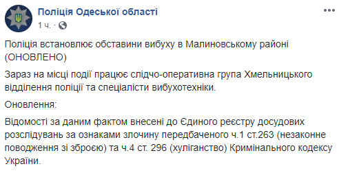 "Полиция устанавливает обстоятельства взрыва в Малиновском районе. Сейчас на месте происшествия работает следственно-оперативная группа Хмельницкого отделения полиции и специалисты-взрывотехники", - говорится в сообщении.