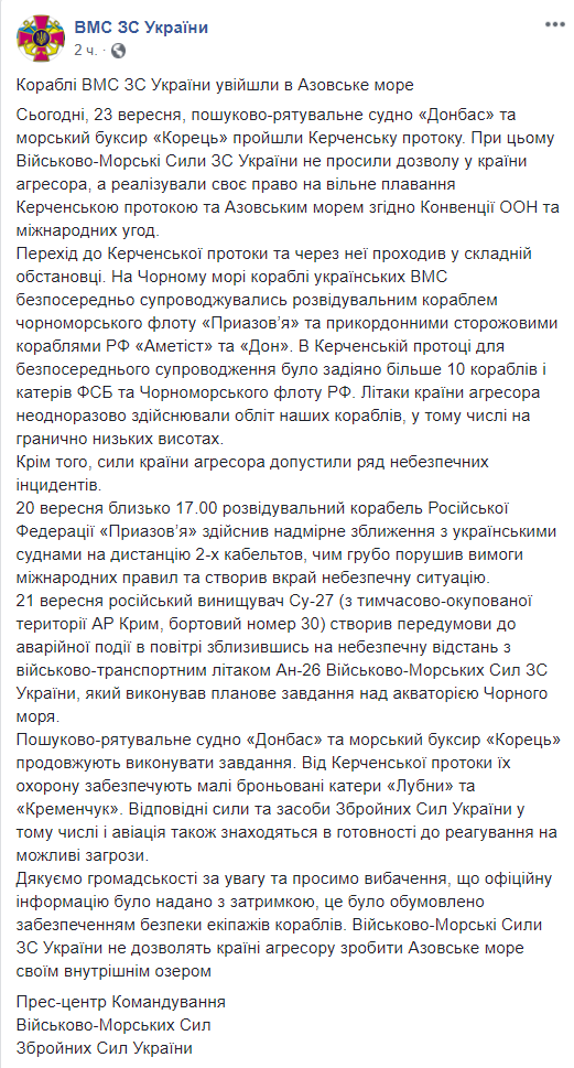 "Переход к Керченскому проливу и через нее проходил в сложной обстановке. На Черном море корабли украинских ВМС непосредственно сопровождались разведывательным кораблем Черноморского флота "Приазовье" и пограничными сторожевыми кораблями РФ "Аметист" и "Дон". В Керченском проливе для непосредственного сопровождения было задействовано более 10 кораблей и катеров ФСБ и Черноморского флота РФ. Самолеты страны агрессора неоднократно совершали облет наших кораблей, в том числе на предельно низких высотах", сообщает пресс-служба ВМС Украины.
