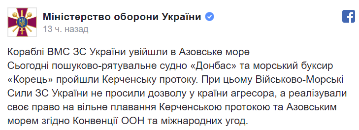 "Военно-Морские Силы Украины не просили разрешения у страны агрессора, а реализовали свое право на свободное плавание Керченским проливом и Азовским морем согласно Конвенции ООН и международных соглашений", - сказано в заявлении Минобороны.