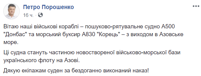 Спасибо экипажам судов по безупречно выполненный приказ!", - написал в Facebook президент Петр Порошенко.