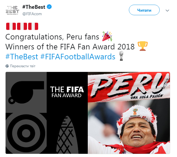 В понедельник, 24 сентября, в Лондоне на церемонии The Best FIFA Football Awards, лучшими футбольными болельщиками сезона признаны любители футбола из Перу.