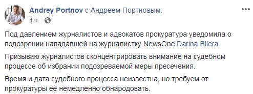 Он отмечает, что это было сделано под давлением журналистов и адвокатов. "Призываю журналистов сконцентрировать внимание на судебном процессе об избрании подозреваемой меры пресечения", - пишет он. Портнов добавляет, что время и дата судебного процесса неизвестна, но он требует от прокуратуры ее немедленно обнародовать.