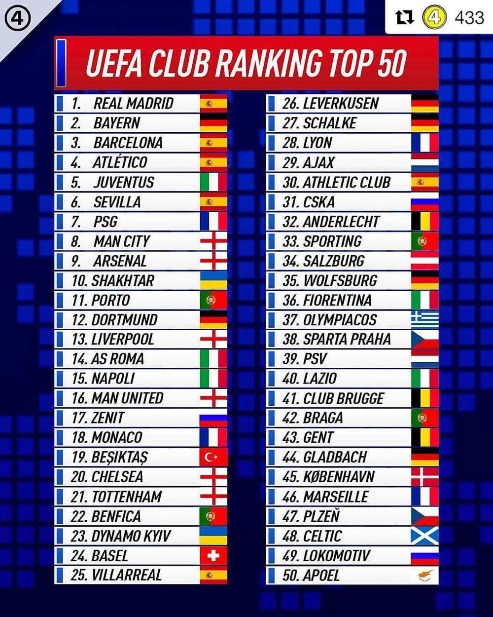 В УЕФА обновили рейтинг клубов по итогам первого раунда группового этапа в Лиге Чемпионов и Лиги Европы. Представители Украины расположились на 10-м и 23-м местах среди всех футбольных команд Европы.