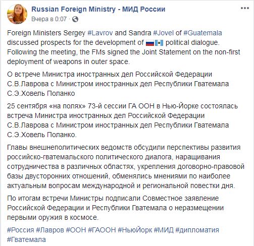 Во вторник, 25 сентября, Россия и Гватемала договорились не размещать в космосе оружие первыми. Об этом сообщается в пресс-службе российского МИД в Facebook.