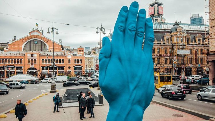 Рука в Киеве на время. Она, по уверению КГГА, символизирует дружбу и общение в рамках инициативы "Киев - город мира". Инициатором установки объекта стало румынское посольство, которое везде продвигает свой проект "Moving Monuments" (Движущиеся памятники).