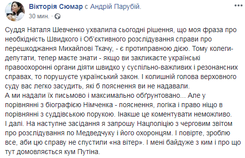 "Поэтому коллеги-депутаты, теперь должны знать - если вы призываете украинские правоохранительные органы действовать быстро в общественно важных и резонансных делах, то нарушаете украинский закон. И бывший председатель Верховного суда вас легко осудит, какие бы объяснения вы не предоставляли", - заявила Сюмар.