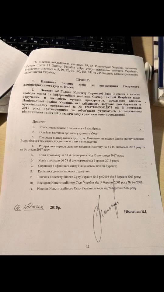Тем самым суд частично удовлетворил иск народного депутата из фракции "Оппозиционный блок" Василия Нимченко. В своей жалобе он утверждает, что Сюмар не имела права этого делать и назвал ее заявления вмешательством в расследование прокуратуры и полиции.