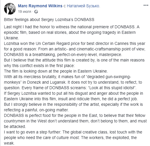 "Я ни разу не театральный или кинематографический критик. Посмотрел как бы #фильм #Донбасс, который снял замечательный белорусский #режиссер #Лозница как бы по документальным свидетельствам и основанный как бы на реальных событиях. Это сейчас как бы модно.