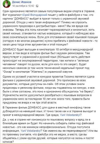 "Юра, я думаю так же как и Вы. Фильм должен быть представлен зрителю в том виде, в каком он был создан. Мы записывали звук на площадке и это очень серьезная работа и часть звукового решения картины. Дублирование фильма на украинский язык, я уже не говорю о том, что я не уверен в качестве дубляжа в силу того, что ни опыта, ни умения, ни такого уровня звукорежиссуры пока что в Украине нет, уничтожает фонограмму и влияет, не в лучшую сторону, на восприятие картины. (Я не видел версию фильма с дубляжем. Когда посмотрю, - смогу дать оценку этой работы.) Я против того, чтобы фильмы были дублированы, - на каком бы языке эти фильмы ни снимались. Даже в Германии, которая до последнего держалась этого правила (дублировать фильмы, которые выходят в прокат), поскольку там зрители не привыкли читать субтитры, сдалась, и сейчас "Донбасс", например, показывают в оригинальной версии с немецкими субтитрами. И ничего - фильм держится уже третью неделю в кинотеатрах. Вообще-то дубляж - это для тех, кто не умеет читать! У этого вопроса в Украине есть и другой аспект - война с русским языком, которую в той или иной форме пытаются вести разные политики. Вести такие войны глупо. Ни к чему, кроме одичания, эти войны привести не могут. В стране, где половина населения (статистики могут меня поправить) говорит на русском языке, делать вид, что такого языка не существует - форма идиотизма, корни которого можно поискать в советских традициях лжи. К сожалению дарованную временно свободу используют для того, чтобы создать новые формы несвободы. Лучше бы усилия эти были потрачены на созидание, а не на разрушение, на разрешение, а не на запреты, которые вводятся тихой сапочкой, под шумок и относительную тишину заинтересованных сторон".