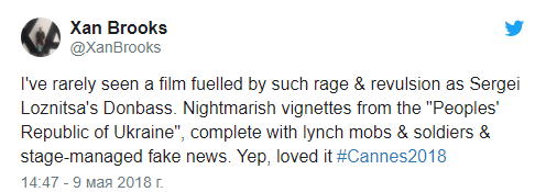 "Редко вижу фильм, настолько наполненный яростью и отвращением, как Донбасс Сергея Лозницы. Кошмарные сцены из "народной республики" Украины дополняют суд Линча, солдаты и фейковые постановочные новости. Да, мне очень понравилось", - написал журналист Ксан Брукс.
