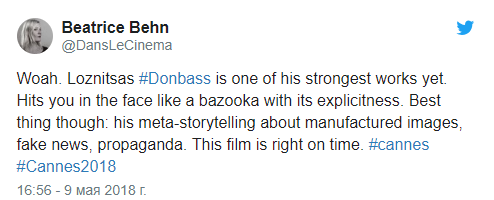 "Донбасс - одна из сильнейших работ Лозницы. Шарашит тебе в лицо, как базука своей эксплицитностью. Самое лучшее - его метасторителлинг о сфабрикованных кадрах, фейковых новостях и пропаганде. Фильм появился в правильное время", - написала Беатриче Бен.