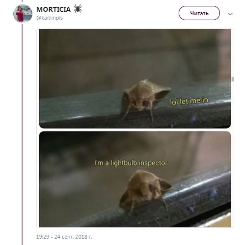 Однако настоящую популярность мем приобрел лишь в конце сентября. Чаще всего создатели смешных картинок использовали изображение огромного мотылька, которое ранее публиковали пользователи Reddit. Насекомое даже сделали участником второго популярного мема про неверного парня и даже представителе мотылька в качестве инспектора ламп.