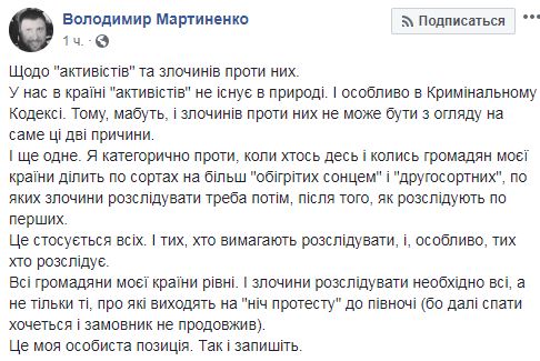 "У нас в стране "активистов" не существует в природе. И особенно в Уголовном Кодексе. Поэтому, видимо, и преступлений против них не может быть ввиду именно этих двух причин", - заявил он. Мартыненко также отметил, что он "категорически против, когда кто-то где-то и когда-граждан страны делит по сортам на более "обогретых солнцем" и "второсортных", по которым преступления расследовать надо потом, после того, как расследуют во первых".