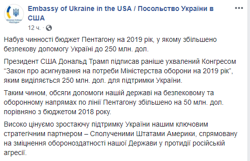 "Президент США Дональд Трамп подписал ранее принятый Конгрессом" Закон об ассигнованиях на нужды Министерства обороны на 2019 ", которым выделяется 250 млн. долл. для поддержки Украины", - сказано в сообщении.