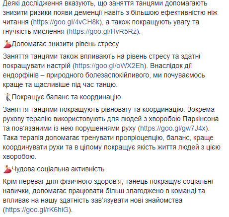По словам Супрун, занятия танцами позволяют поддерживать здоровый вес, повышают выносливость и помогают укрепить кости и мышцы, помогают держать тело в тонусе, снижают артериальное давление, влияют на уровень холестерина в крови.