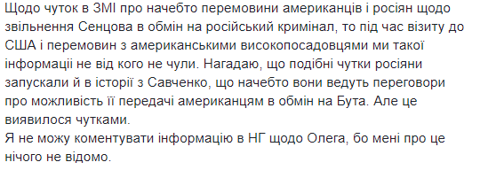 "Относительно слухов в СМИ о якобы переговорах американцев и россиян по освобождению Сенцова в обмен на российский криминал, то во время визита в США и переговоров с американскими высокопоставленными лицами мы такой информации ни от кого не слышали", - заявила Геращенко.