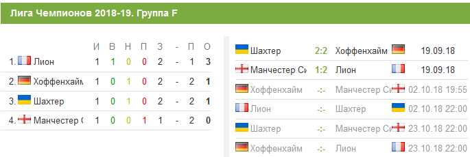 Лига чемпионов. Турнирная таблица в группе F перед вторым туром