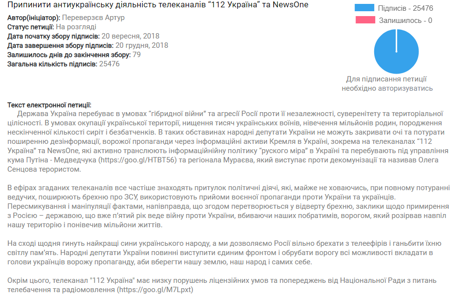 Напомним, на сайте Верховной Рады электронная петиция "Прекратить антиукраинскую деятельность телеканала "112 Украина" и "NewsOne" по состоянию на 1 октября набрала более 25 тысяч голосов, при том, что дата завершения сбора подписей – 20 декабря.