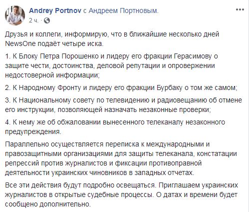 В ближайшее время телеканал NewsOne подает четыре иска в украинские суды по защите чести и достоинства, по отмене "проверочной" инструкции Нацсовета, а также об обжаловании вынесенного телеканалу предупреждения. Об этом на своей странице в Facebook заявил известный юрист Андрей Портнов, которому переданы права по управлению NewsOne.