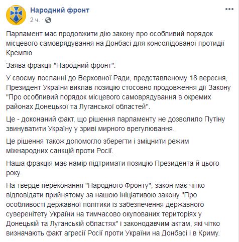 Фракция Верховной Рады "Народный фронт" выступила за продление парламентом действия закона "Об особом порядке местного самоуправления на Донбассе" для "консолидированного противодействия Кремлю". Об этом сказано в заявлении фракции в Facebook.