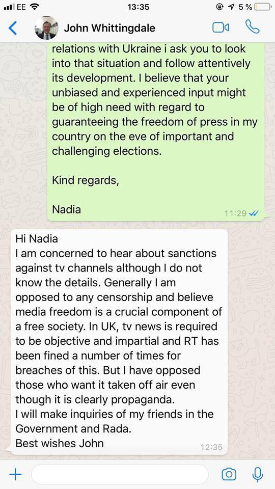 "В Соединённом Королевстве от телевизионных новостей требуют быть объективными и беспристрастными, и телеканал Russia Today штрафовали за нарушение этого принципа. Однако я всегда выступал против тех, кто хотел запретить трансляцию RT, пусть в его случае речь бесспорно идет о пропаганде", - разъяснил свой подход Уиттиндейл. Он пообещал обратиться к своим знакомым в правительстве и парламенте Украины за разъяснениями по данной ситуации.