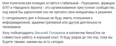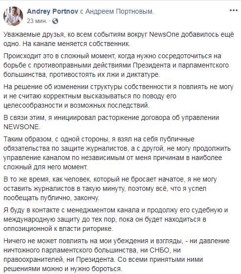"В связи этим я инициировал расторжение договора об управлении NewsOne. Таким образом, с одной стороны, я взял на себя публичные обязательства по защите журналистов, а с другой, не могу продолжить управление каналом по независимым от меня причинам в наиболее сложный для него момент. В то же время, как человек, который не бросает начатое, я не могу оставить журналистов в такую минуту, поэтому всё, что я успел пообещать публично, закончу", - сообщил Портнов.