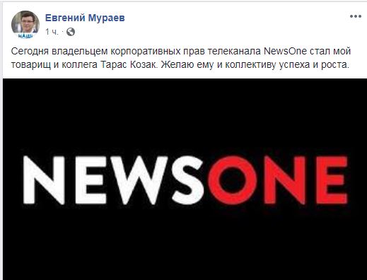 "Сегодня владельцем корпоративных прав телеканала NewsOne стал мой товарищ и коллега Тарас Козак. Желаю ему и коллективу успеха и роста", - написал Мураев.