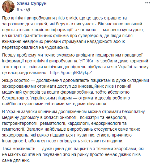 Исполняющая обязанности министра здравоохранения Ульяна Супрун сообщила, что утверждение о вреде клинических испытаний лекарств для людей, принимающих в них участие, является мифом. Об этом она написала на своей странице в Facebook.