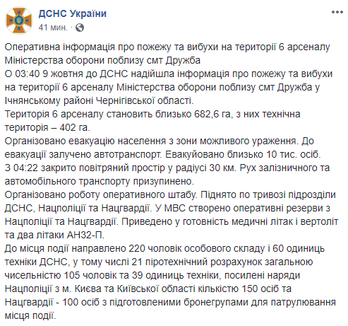 Из состава ГосЧС к месту происшествия направлены 220 работников и 60 единиц техники, в том числе 21 пиротехнический расчет общей численностью 105 человек и 39 единиц техники, усиленные наряды Нацполиции из Киева и Киевской области количеством 150 человек и Нацгвардии - 100 человек с подготовленными бронегруппами для патрулирования места происшествия.