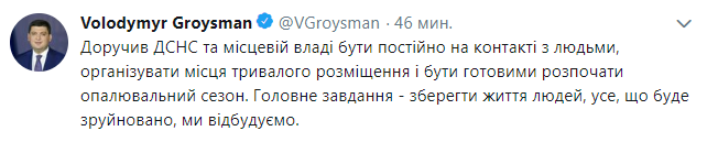 Гройсман также поручил Государственной службе по чрезвычайным ситуациям и местной власти быть постоянно на контакте с людьми, организовать места длительного размещения и быть готовыми начать отопительный сезон в Черниговской области.