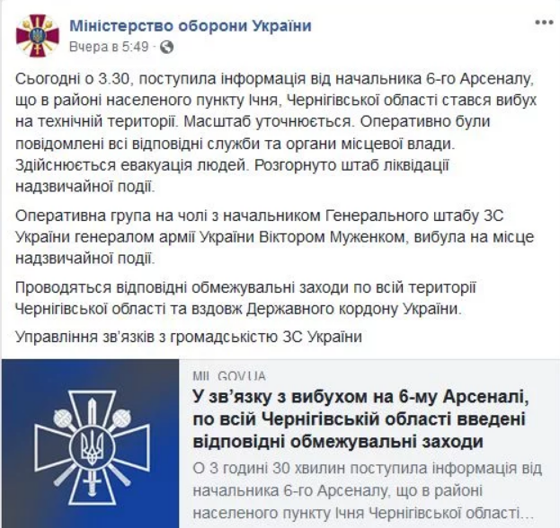 • В 05:49 Минобороны на своей странице в Facebook сообщает о пожаре на арсенале. Никаких предупреждений на радио или государственных каналах нет.