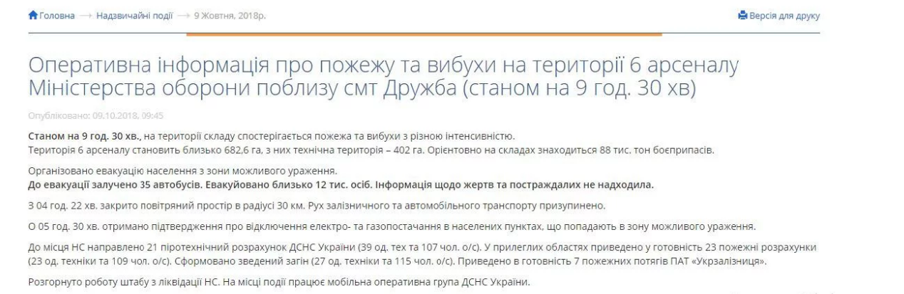 • 09:45 – ГосЧС на своем сайте публикует оперативную информацию о ситуации на 6-м арсенале по состоянию на 09:30. Среди прочего в ней спасательная служба говорит: "Ориентировочно на складах находится 88 тыс. тонн боеприпасов".