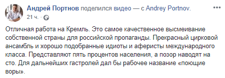 "Это самое качественное высмеивание собственной страны для российской пропаганды. Прекрасный цирковой ансамбль и хорошо подобранные идиоты и аферисты международного класса. Представляют пять процентов населения, а позор наводят на сто. Для дальнейших гастролей дал бы рабочее название "поющие воры".