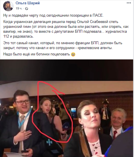 "Ну и подведём черту под сегодняшним позорищем в ПАСЕ. Когда украинская делегация решила перед Ольгой Скабеевой спеть украинский гимн (от этого она должна была или растаять, или сгореть, как вампир, не знаю), то вместе с депутатами БПП подпевала... журналистка 112 и радовалась.