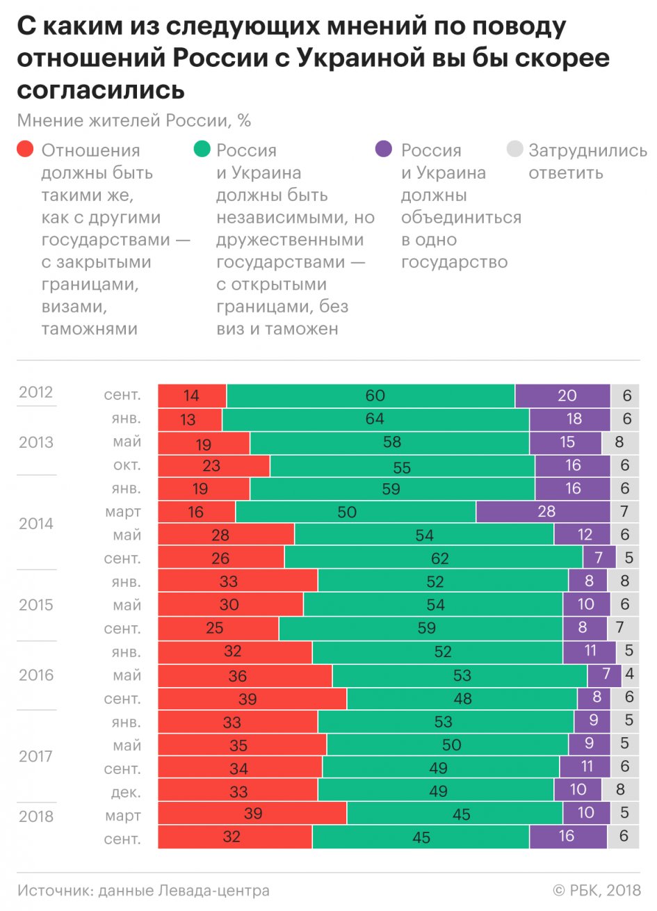 На протяжении многих лет наблюдается асимметрия отношения украинцев к России и россиян к Украине, констатирует руководитель отдела социокультурных исследований Левада-центра. Причем, по словам российского социолога Алексея Левинсона, в РФ наблюдается больше негатива не только по отношению к Украине, но и по отношению к другим странам бывшего Советского Союза. Об этом свидетельствуют исследования отношения к разным странам СНГ. Социолог предполагает, что это может быть связано с тем, что россияне воспринимают все страны СНГ как "совершившие предательство" и покинувшие СССР. "Я бы не сказал, что в данном случае это специфически антиукраинские настроения. Они, безусловно, присутствуют и усилены пропагандой, которую вели в период активных боевых действий в Донбассе, но они тут не главное", - считает эксперт.