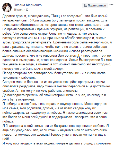 "Во время подготовки к прямым эфирам, на репетиции, я сломала два ребра. Это была очень острая боль, но я подумала, что сильно потянула связки или мышцы, принимала обезболивающее и, сцепив зубы, продолжала репетировать. Временами боль была нестерпимой, я шла в раздевалку, плакала, чтобы никто не видел, ставила себе еще более сильные обезболивающие инъекции и снова репетировала", - написала Оксана Марченко, отметив, что участие в шоу было очень важно для нее, поскольку это мечта ее дочери.