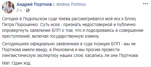 Сегодняшняя официально заявленная в суде позиция БПП - мы не Портнова имели ввиду, а Януковича и мы просим провести лингвистическую экспертизу наших слов, касались ли они Портнова.