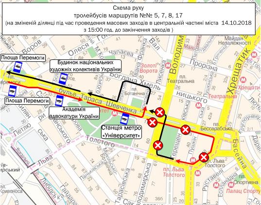 14 октября с 15:00 в связи с проведением массовых мероприятий в центральной части города ко Дню защитника Украины и соответствующим запретом движения всех видов транспорта на ул. Владимирской (на участке от ул. Льва Толстого до бульвара Тараса Шевченко), б-ре ​​Тараса Шевченко (на участке от ул. Владимирской до Бессарабской площади), ул. Крещатик (на участке от Бессарабской площади до Европейской площади), Европейской площади вносятся изменения в работу наземного общественного транспорта.