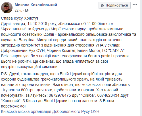 8:57  Националисты пообещали сегодня снести памятник Ватутину в Мариинском парке. Это генерал, освобождавший Киев.