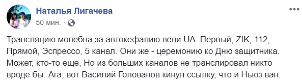 12:20  Возвращаясь к теме молебна за Томос. Оказывается, большие телеканалы его не транслировали, пишет в Facebook медиаэксперт Наталья Лигачева. Это аудитории не слишком интересен автокефальный бенефис Порошенко или собственникам ТВ?