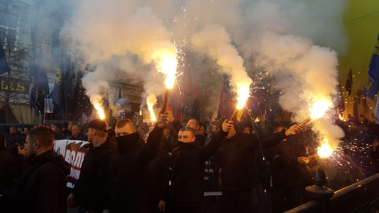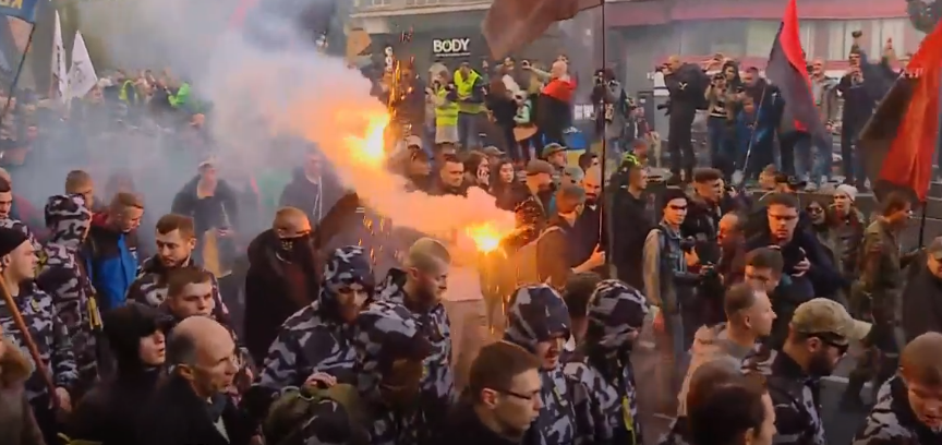 17:05  Вся колонна националистов окутана дымом. Кричат "Бандера наш герой".